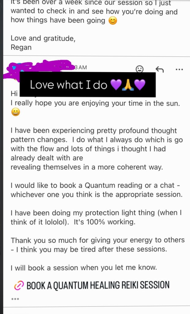 “Regan’s beautiful radiant light shines the moment you meet with her and embraces you unconditionally. I felt at such ease in her magical presence and the reading was truly a life changing experience. Regan’s reading was exactly what I needed to hear on my spiritual journey. The information is delivered with so much love, respect and care that you feel her every word resonating in your heart. Regan truly cares and her mission of transforming the darkness with such pure loving intent is felt. Truly and highly recommend booking any of her services. There is a reason your soul brought you here please follow your heart and book a service you won’t regret it. It was a true privilege and honor being guided to Regan. Forever grateful!
